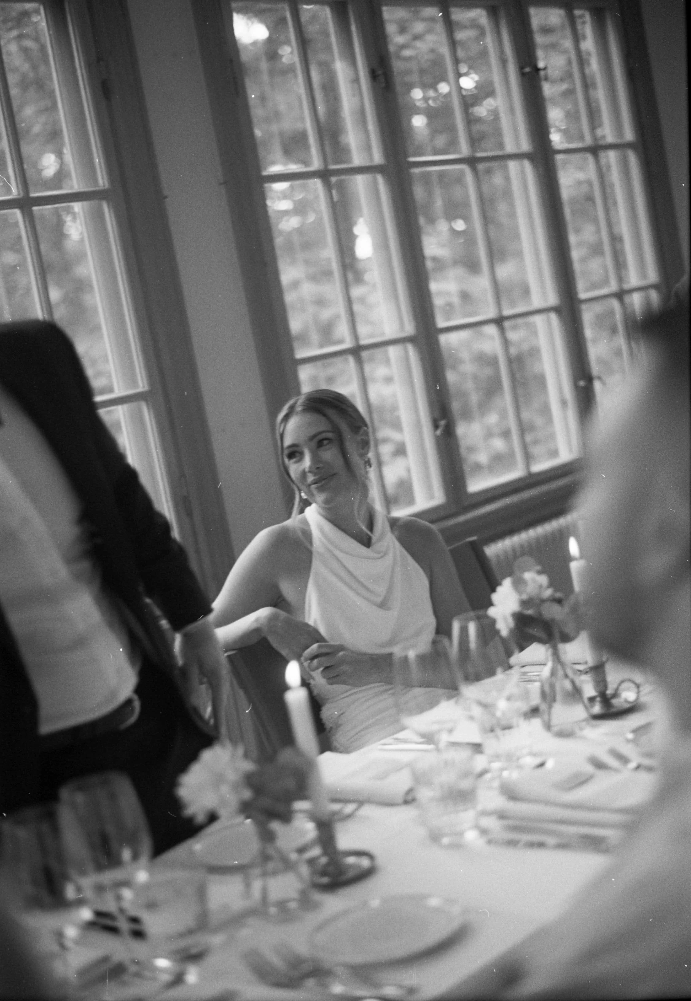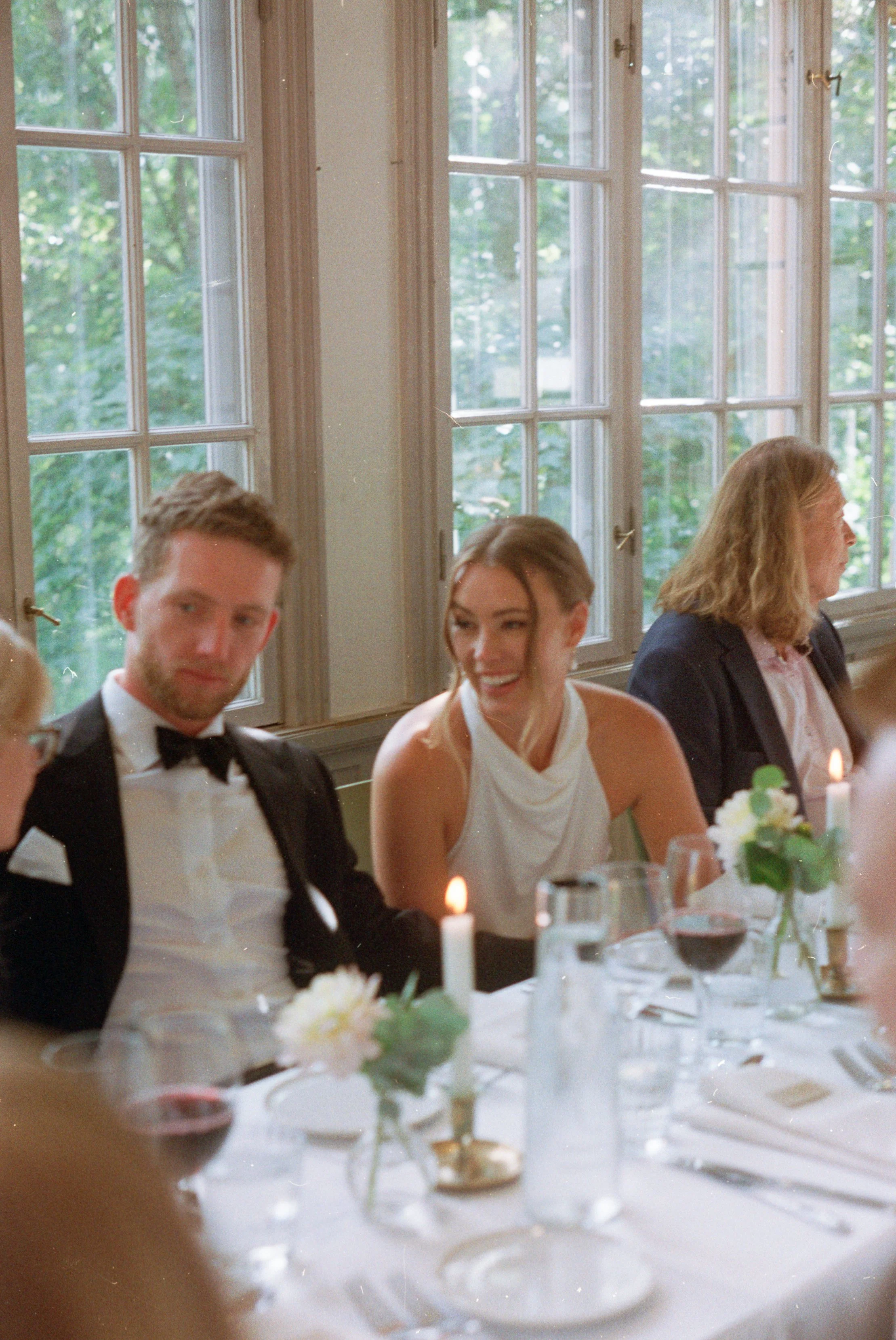 Jag fotograferar också analogt. Med flera olika kameror fångar jag ögonblick på 35mm-film – från korniga porträtt av brudparet till blixtbilder mitt i dansen. Jag framkallar på labb och skannar allt själv hemma. Ni får ett digitalt urval fullt av känsla: dammigt, suddigt, oförutsägbart – som minnen brukar vara.
